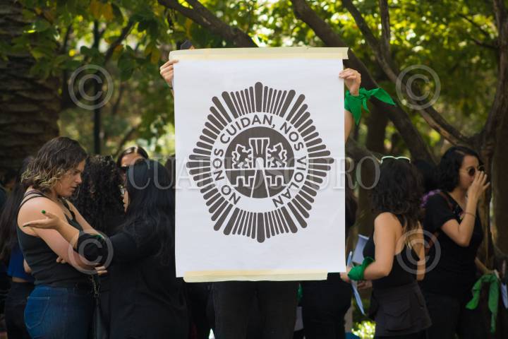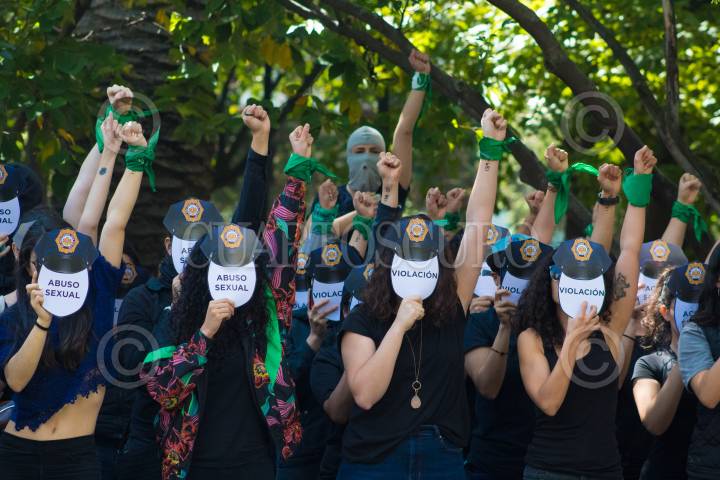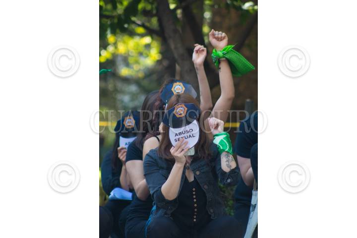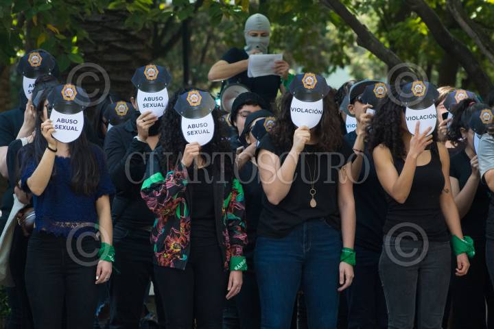 Un grupo feminista realizó un performance para exigir justicia por los casos de abuso sexual presuntamente cometidos por policías. Durante el performance el grupo de mujeres cubrio su rostro con impresiones de gorros de policías y la frase "Abuso sexu