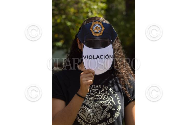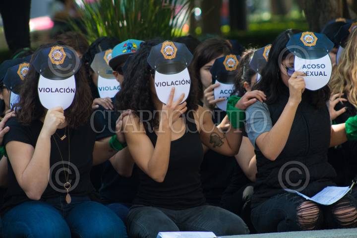Un grupo feminista realizó un performance para exigir justicia por los casos de abuso sexual presuntamente cometidos por policías de la Ciudad en distintas Alcaldías. Durante el performance el grupo de mujeres cubrió su rostro con impresiones de gorros de policías y la frase "Abuso sexual"