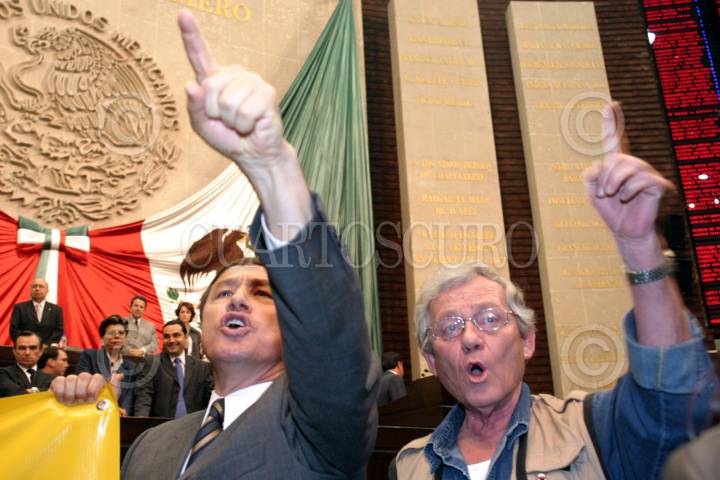 MEXICO, D.F., 14ABRIL2005.- Víctor Suárez Carrera y Salvador Martínez Della Roca, diputados del PRD, durante las manifestaciones que realizaron los perredistas en la sesión de la Cámara de Diputados. FOTO: Moisés Pablo/CUARTOSCURO.COM