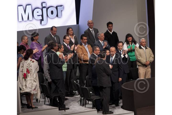 MÉXICO, D.F., 28MARZO2012.- Felipe Calderón Hinojosa Presidente de México, durante su informe “Un Gobierno Democrático que Rinde Cuentas” que se realizo en el Auditorio Nacional. Al final del informe se despide de Alejandro Poire Secretario de Gobernación y de Genaro García Luna Secretario de Seguridad Publica Federal. FOTO: GUILLERMO PEREA /CUARTOSCURO.COM