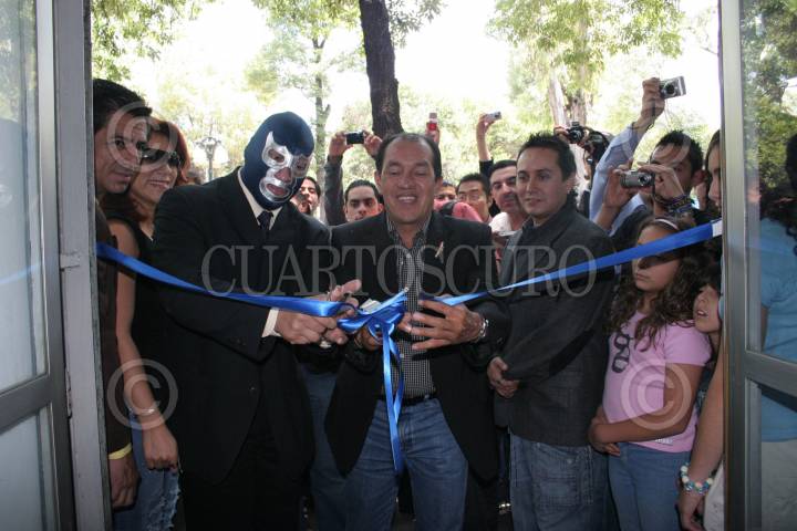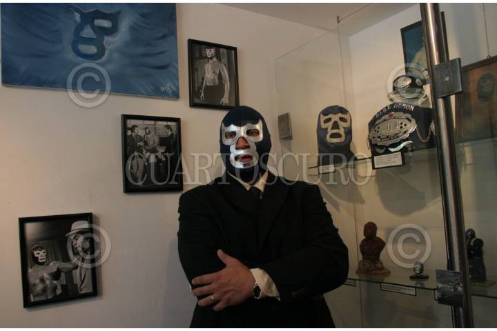 MÉXICO, D.F. 15MAYO2007.-Blue Demon Jr encabezo la inauguración de la galería Blue Demon, en la cual se pretende además de vender mascaras, playeras, libros y juguetes, hacer exposiciones de diversos luchadores con grandes trayectorias para dar difusión a dicho deporte. Actualmente se encuentra instalada la vida de su padre Blue Demon, en donde expone las mascaras que arrebato a lo largo de su carrera, así como su vestimenta y los cinturones que gano. FOTO: EZEQUIL TLAXCALA/ CUARTOSCURO.COM