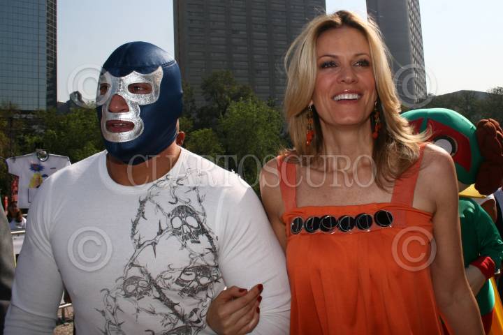 MEXICO, D.F., 01MAYO2005.- El luchador Blue Demon jr. y la conductora de Televisión Rebeca de Alba (en la imagen), anunciaron el proyecto "Kilometros de Lucha", que consiste en una carrera y una caminata de 5 Kilometros. que se reaizará el proximo 25 de Mayo en el Zócalo de la ciudad, con la finalidad de recaudar fondos para apoyar a niños que padecen de la enfermedad del cáncer. FOTO: ADOLFO PÉREZ BUTRÓN/CUARTOSCURO.COM
