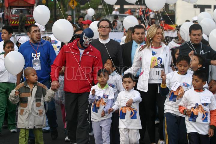 MÉXICO D.F., 25MAYO2008.- El luchador Blue Demon Jr y la conductora Rebeca de Alba acompañados de niños enfermos de cáncer dieron una vuelta al Zócalo de la ciudad de México momentos antes del silbatazo de salida de la carrera Kilómetros de Lucha, con un recorrido de 5 y 10 kilómetros. FOTO: RODOLFO ANGULO/CUARTOSCURO.COM