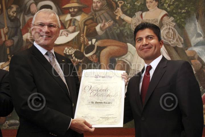PUEBLA, PUEBLA, 22ENERO2012.- Eduardo Rivera, Alcalde de Puebla realizó la entrega del reconocimiento al visitante distinguido a Denis Ricard, Secretario General de la Organización de la Ciudades Patrimonio Internacional. FOTO: HILDA RIOS/CUARTOSCURO.COM