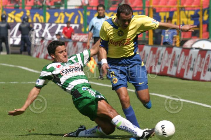MEXICO, D.F. 30ENERO2005.- Cuauhtemoc Blanco (América), disputó un balón con Denis Ramón Acuña (Santos) en el partido de la jornada 3 del torneo de clausura 2005 en el que las águilas del América derrotó 4 goles a 2 a Santos Laguna. FOTO: Iván Stephens/CUARTOSCURO.COM