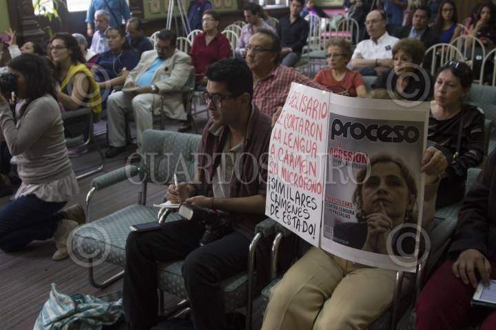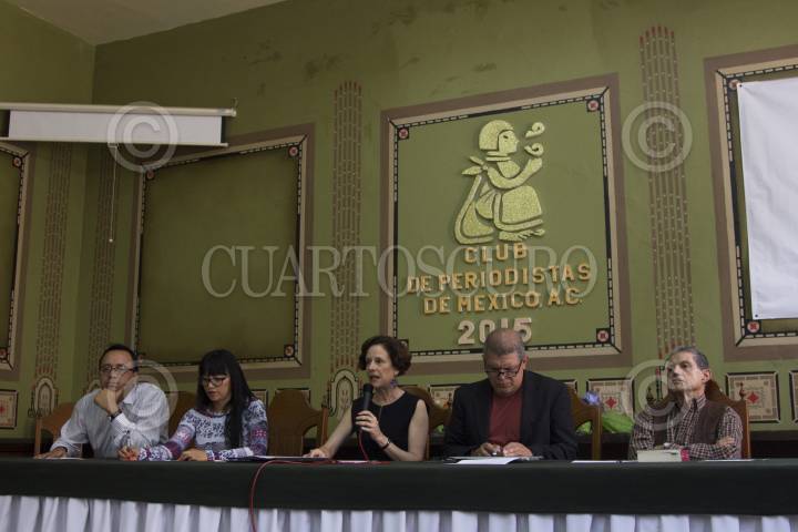 MÉXICO, D.F., 19MAYO2015.- David Peña, Karla Salas, Denisse Dresser, Rafael Pienda y Héctor Bonilla, durante una conferencia en donde hablaron sobre el estatus de las demandas de amparo para defender el derecho de las audiencias, reconocido en la Ley Federal de Telecomunicaciones y Radiodifusión, frente a la arbitraria y abrupta salida del aire del noticiero encabezado por la periodista Carmen Aristegui. FOTO: MOISÉS PABLO /CUARTOSCURO.COM