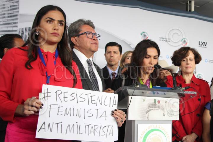 La diputada Alessandra de la Rojo, la escritora Denisse Dresser y feministas se protestaron durante una conferencia del senador Ricardo Monreal en el Senado de la República
