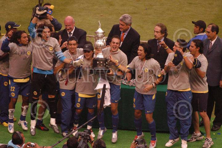 MEXICO D.F.29MAYO2005.- En el estadio azteca, Las Aguilas del América conquistó su décimo campeonato en el fútbol mexicano, al imponerse 6-3 a Tecos de la UAG, en la final del torneo Clausura 2005. Cuauhtemoc Blanco capitàn del Club América alza el trofeo de campeón. FOTO: Germán Romero/CUARTOSCURO.COM