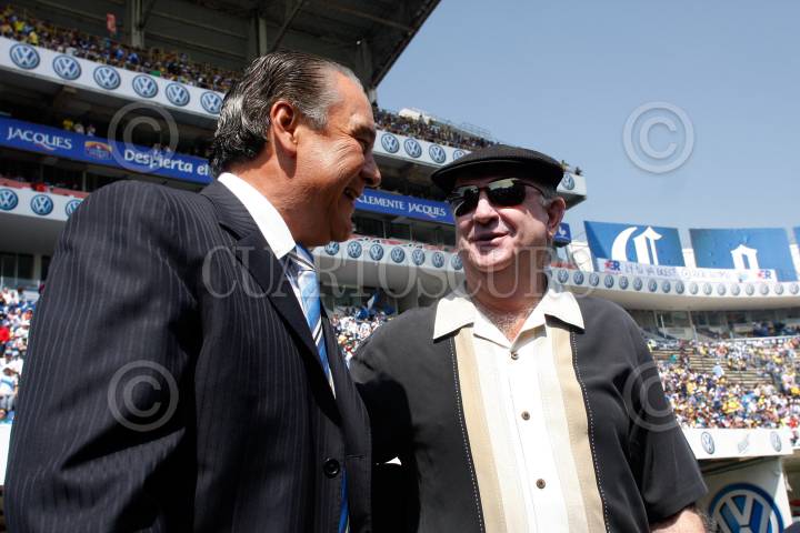 PUEBLA, PUELBA, 17OCTUBRE2010.- José Luis Trejo, director técnico del Puebla de la Franja, saludó a su colega Manuel Lapuente, estratega de las Águilas del América, antes de iniciar el partido en la cual ambas escuadras obtuvieron un empate de 2 a 2 durante la jornada 12 del torneo apertura 2010. FOTO: FRANCISCO GUASCO/CUARTOSCURO.COM