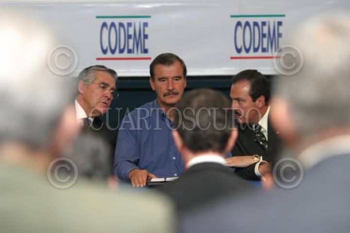 México, D.F. 19 MARZO 2004.- Nelson Vargas, titular de la CODEME, Vicente Fox, primer mandatario y Enrique Martínez Martínez, gobernador de Coahuila durante la Asamblea general ordinaria de asociados de la Confederación Deportiva. FOTO: Sandra Perdomo/CUARTOSCURO.COM