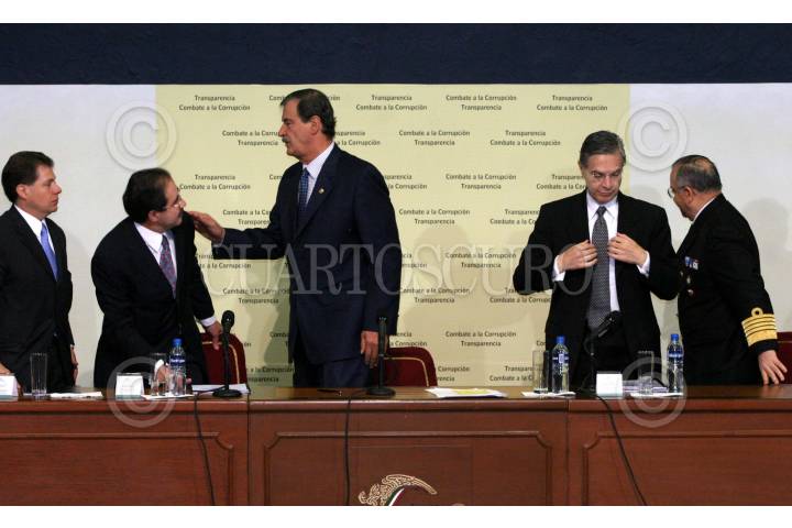 México D.F. 12 MARZO 2004.- Al centro el presidente Vicente Fox saluda a los secretarios que participaron en la Octava sesión de la Comisión intersecretarial para la transparencia y cambate a la corrupción. FOTO: Sandra Perdomo/CUARTOSCURO.COM