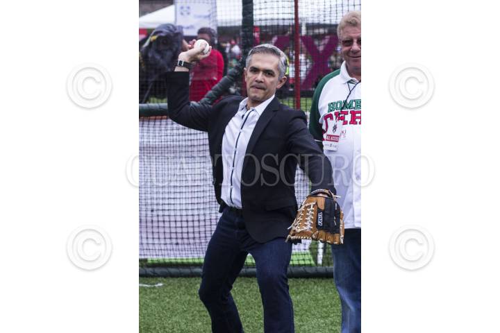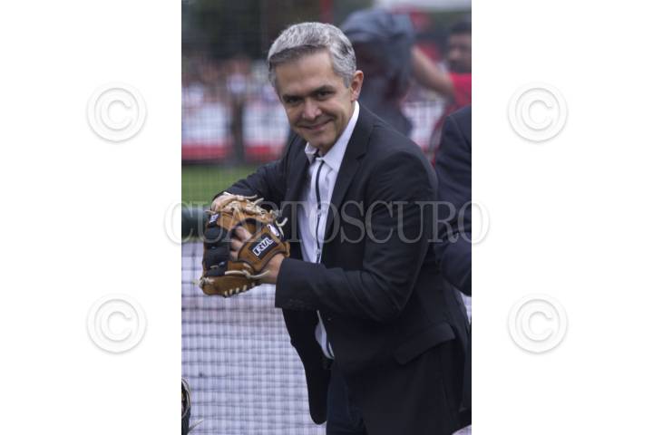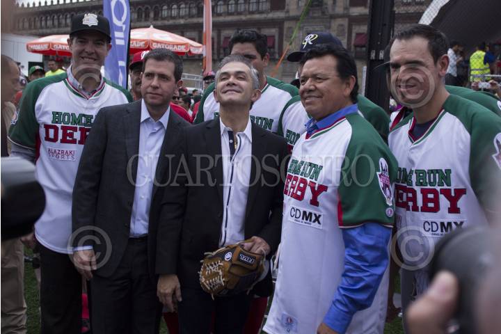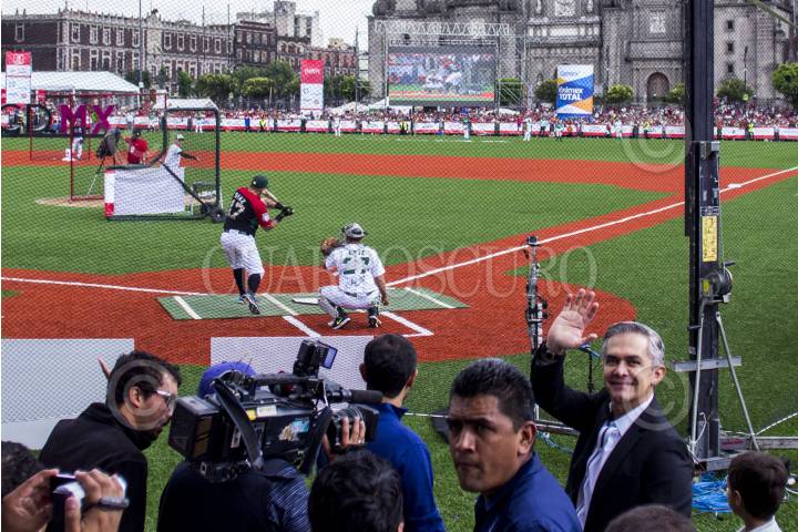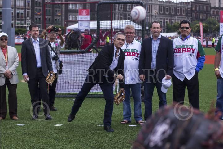 MÉXICO, 14JUNIO2015.- Miguel Ángel Mancera realizó el lanzamiento inaugural Home Run Derby en el Zócalo Capitalino donde miles de personas pudieron apreciar a bateadores de la Liga Mexicana de Béisbol lanzando sus mejores golpes durante casi dos horas en la cancha que fue habilitada en la plancha. FOTO: ENRIQUE ORDÓÑEZ /CUARTOSCURO.COM