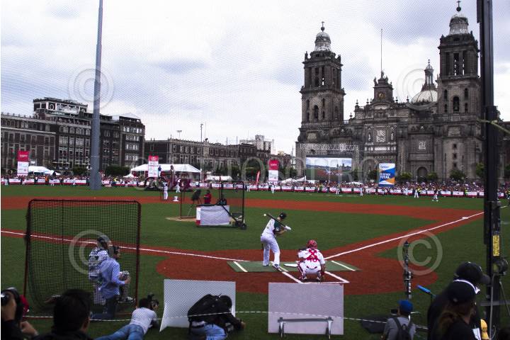 MÉXICO, 14JUNIO2015.- Frank Diaz en la imagen bateando Miguel Ángel Mancera realizó el lanzamiento inaugural Home Run Derby en el Zócalo Capitalino donde miles de personas pudieron apreciar a bateadores de la Liga Mexicana de Béisbol lanzando sus mejores golpes durante casi dos horas en la cancha que fue habilitada en la plancha. FOTO: ENRIQUE ORDÓÑEZ /CUARTOSCURO.COM