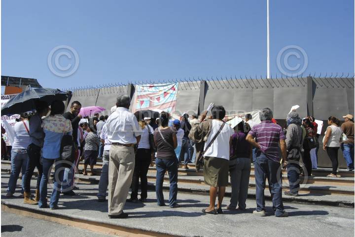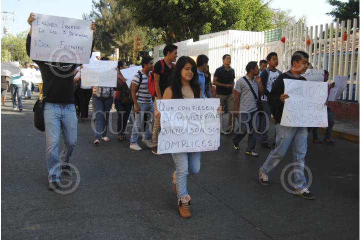 CHILPANCINGO, GUERRERO, 15ABRIL2015.- Continua la protesta por el presidente del comité de la colonia Lomas del Pedregal, Esteban Mora Villanueva, que fue detenido junto con su cuñado Efrén Mora Baño y el tesorero del comité Bernabé Vázquez Morales, este último estudiante del segundo año de la Unidad Académica de Derecho de la Universidad Autónoma de Guerrero (UAGro) , quienes fueron detenidos por la Policía Ministerial por encontrar droga en su camioneta, posteriormente colonos marcharon hacia el Palacio Municipal, para exigir audiencia con el gobernador y el procurador, para exigir la liberación de los detenidos. Los familiares aseguraron que la droga les fue sembrada. En la marcha participaron estudiantes en apoyo a su compañero detenido. FOTO: JOSÉ I. HERNANDEZ /CUARTOSCURO.COM