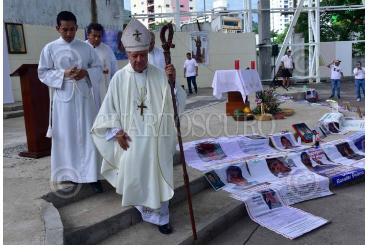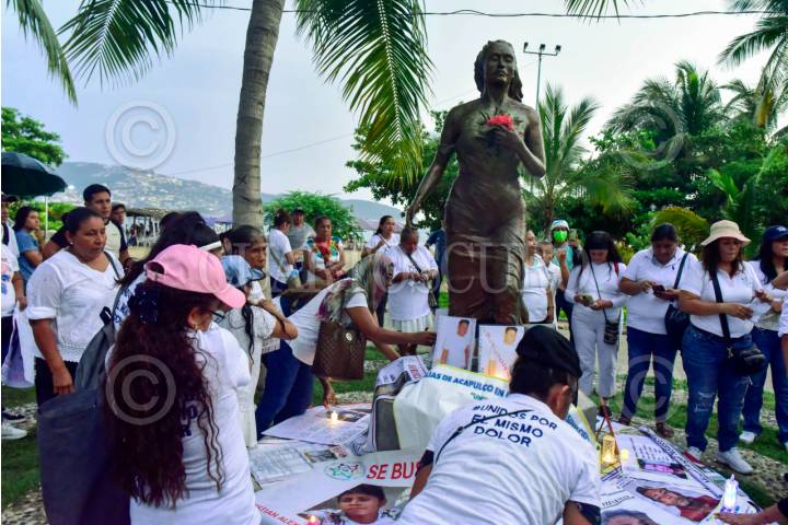ACAPULCO, GUERRERO, 30AGOSTO2025.- Integrantes de Los Colectivos Familias de Acapulco en Busca de sus Desaparecidos y Madres Buscadoras Igualtecas conmemoraron el Día Internacional de las Víctimas de Desaparición Forzada con una misa y una marcha en avenida Costera de Acapulco, así como en el antimonumento de La Esperanza, en donde realizaron un mitin en donde exigieron a las autoridades la identificación de los más de 900 cuerpos que se encuentran en resguardo en las instalaciones del Servicio Médico Forense del estado de Guerrero. FOTO: CARLOS CARBAJAL/CUARTOSCURO.COM