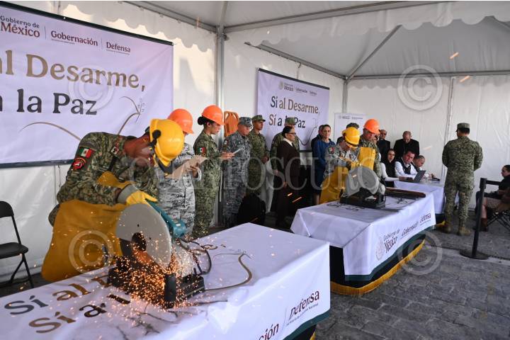 CUERNAVACA, MORELOS, 03JULIO2024.- Soldados de la 24 Zona Militar destruyen una pistola calibre .22, como parte de la "Feria de la Paz y Desarme Voluntario". El evento fue presidido por el gobernador, Cuauhtémoc Blanco Bravo, que estuvo acompañado del general Ernesto José Zapata Pérez, comandante de la primera región militar, José Luis Bucio Quiroz, comandante de la 24 Zona Militar y Gaudencio Ramos Jiménez, coordinador de la Guardia Nacional en la entidad. FOTO: MARGARITO PÉREZ RETANA/CUARTOSCURO.COM