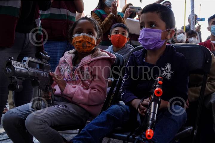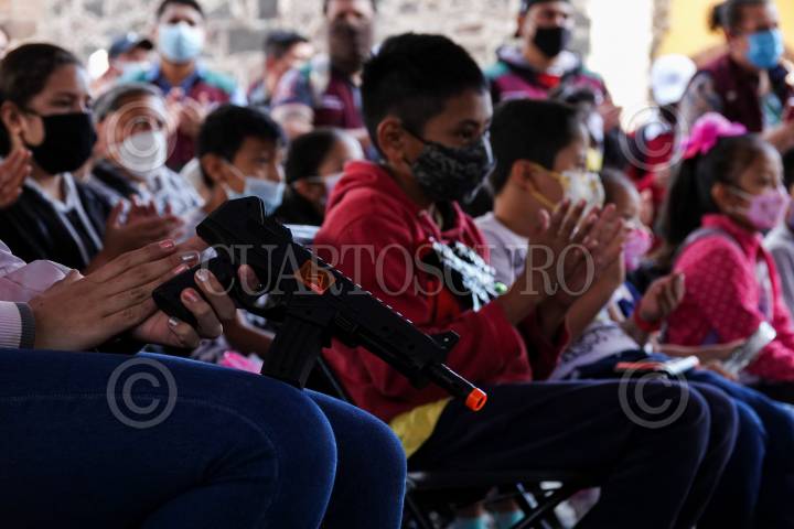 Niñas y niñas de la alcaldía Benito Juárez acudieron a canjear sus armas de juguete por juguetes didácticos como parte del programa "Sí al Desarme. Sí a la Paz".