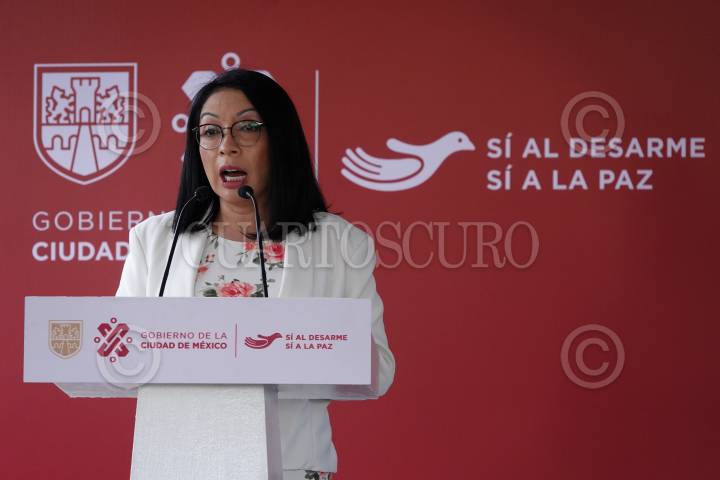 Esthela Damián durante el desarme voluntario "Sí al Desarme. Sí a la Paz" en la alcaldía Benito Júarez.