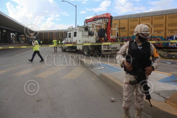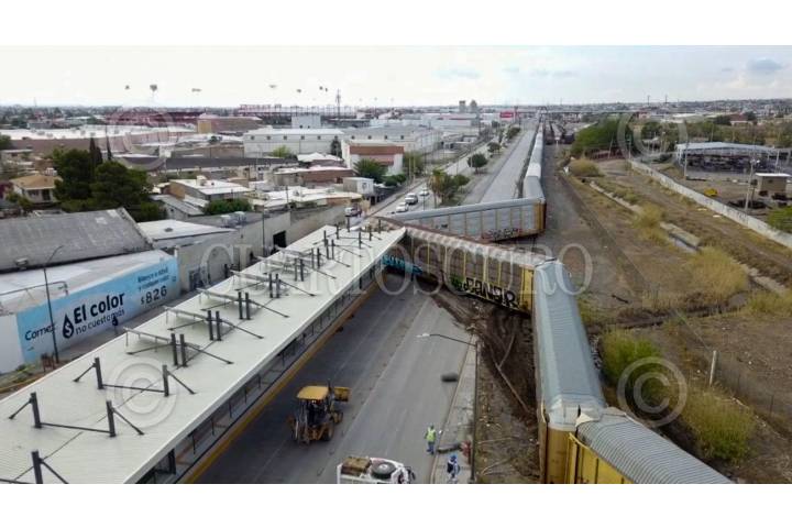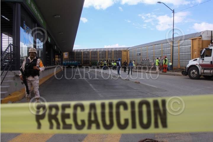 Un vagón de tren se descarrilo el Eje Vial Juan Gabriel, con resultado de daños a uno de los paraderos del transporte semimasivo en Ciudad Juárez, Chihuahua.