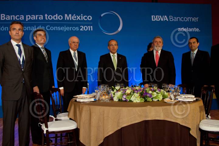 MÉXICO, D.F., 21JUNIO2011.- Ignacio Deschamps, presidente del Consejo de Administración de BBVA Bancomer México, Felipe González, presidente de BBVA Bancomer, y Felipe Calderón Hinojosa, Presidente de los Estado Unidos Mexicanos, durante la comida anual de consejeros regionales de la institución bancaria. FOTO: MOISÉS PABLO/CUARTOSCURO.COM