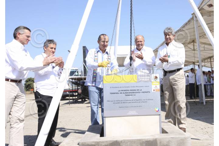 TAPACHULA, CHIAPAS, 14ENERO2012.- Juan José Suárez Copel, director de Pemex, Juan Sabines gobernador del estado, Felipe Calderón Hinojosa, Presidente de México, y Carlos Romero Deschamps, dirigente de los petroleros, presidieron la colocación de la primera piedra de la construcción de la Terminal de Almacenamiento Tapachula. FOTO: ALFREDO GUERRERO/CUARTOSCURO.COM