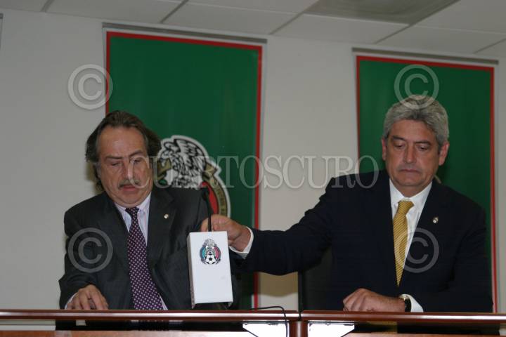 MÉXICO, D.F., 31ENERO2007.- Justino Compeán, Presidente de la FMF, Desio de María, Secretario de la FMF y Hugo Sánchez Márquez, D.T. de la Selección Mexicana, presentaron la lista de convocados para el juego que disputarán en el Estadio Azteca, en una conferencia de prensa en la Federación Mexicana. FOTO: MOISÉS PABLO/CUARTOSCURO.COM