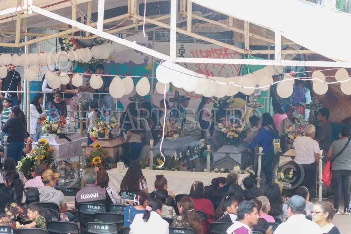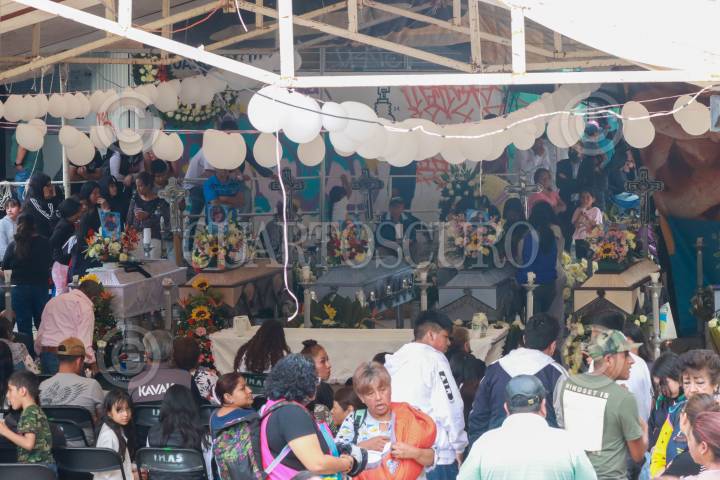 NAUCALPAN, ESTADO DE MÉXICO, 19SEPTIEMBRE2024.- Los seis integrantes de la familia Bejarano: Magdiel (8), Yaretzi (13), Leilani (13), Hilary (15), Kevin (19) y su abuelo Alfonso (58) fueron enterrados en el panteón municipal de San Andrés Atonto del municipio mexiquense. Fue entre globos blancos, flores y una caravana motociclista que familiares, amigos y vecinos despidieron los cuerpos en la colonia Emiliano Zapata previo a trasladarlos al cementerio. Las infantas, el joven y el adulto fueron alcanzados por un deslave de tierra, causado por las intensas lluvias, el pasado lunes 16 de septiembre que destruyó su vivienda en donde se encontraban festejando un cumpleaños. FOTO: GALO CAÑAS/CUARTOSCURO.COM