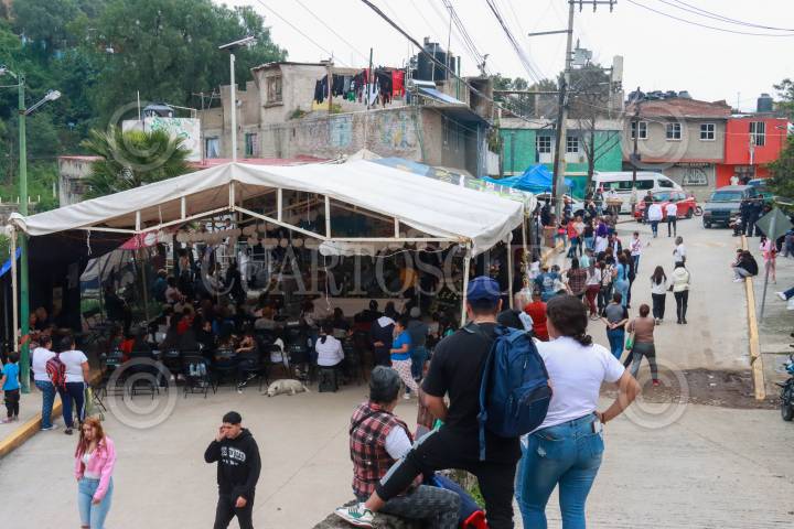 NAUCALPAN, ESTADO DE MÉXICO, 19SEPTIEMBRE2024.- Toma aérea del entierro de los seis integrantes de la familia Bejarano: Magdiel (8), Yaretzi (13), Leilani (13), Hilary (15), Kevin (19) y su abuelo Alfonso (58) fueron enterrados en el panteón municipal de San Andrés Atonto del municipio mexiquense. Fue entre globos blancos, flores y una caravana motociclista que familiares, amigos y vecinos despidieron los cuerpos en la colonia Emiliano Zapata previo a trasladarlos al cementerio. Las infantas, el joven y el adulto fueron alcanzados por un deslave de tierra, causado por las intensas lluvias, el pasado lunes 16 de septiembre que destruyó su vivienda en donde se encontraban festejando un cumpleaños. FOTO: GALO CAÑAS/CUARTOSCURO.COM