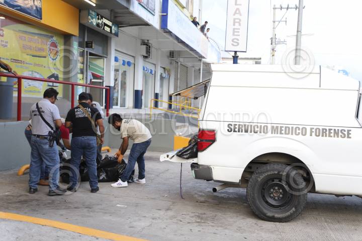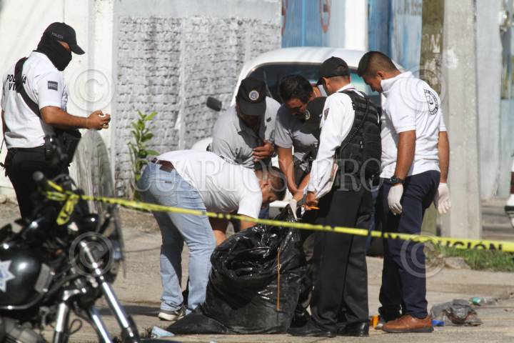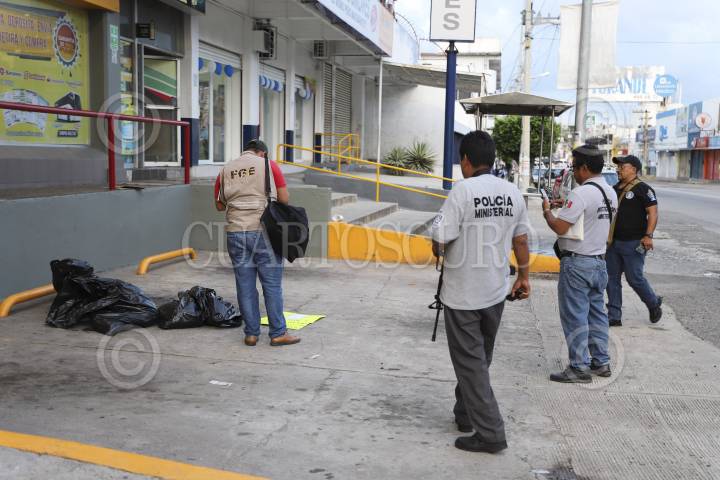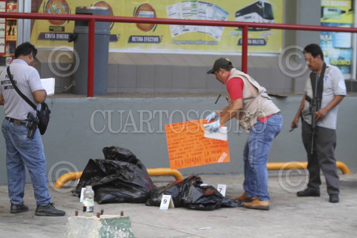 ACAPULCO, GUERRERO, 22OCTUBRE2018.- Fueron hallados tres cuerpos desmembrados que se encontraban en bolsas negras de plástico las cuales estaban regadas en dos diferentes puntos de la avenida Ejido. Uno de ellos se hallaba completamente descuartizado a la altura del semáforo, mientras que los otros se hallaban en bolsas en el estacionamiento de una tienda, hallándose dos cartulinas con mensajes del crimen organizado. Policías Ministeriales del sector Mozimba arribaron primero al lugar, ya que sus instalaciones se encuentran a unas cuadras de la zona donde ocurrió el suceso. Los policías apuntaron como dato preliminar que podrán ser 4 y no tres lo cuerpos. FOTO: BERNANDINO HERNÁNDEZ /CUARTOSCURO.COM