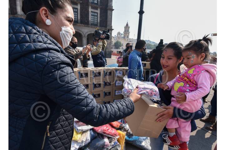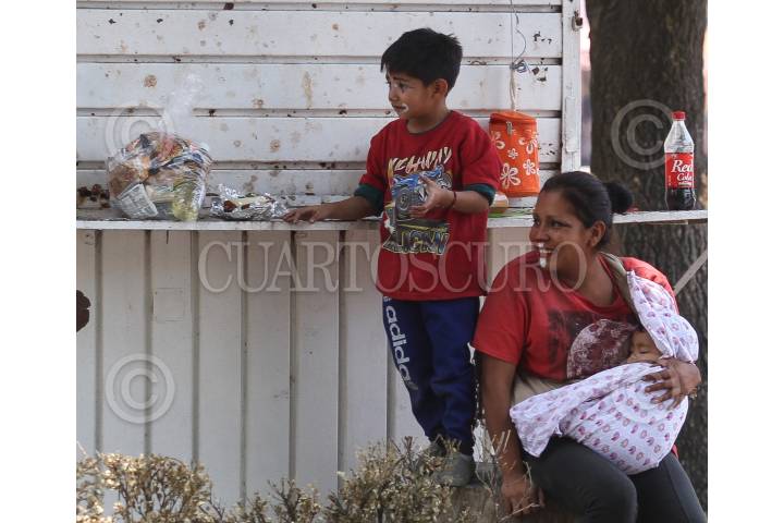 Un niño y su mamá se alegran al recibir dinero y regalos como despensas por parte de automovilistas.