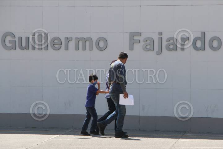 Niño camina entre dos adultos por el Hospital Fajardo.