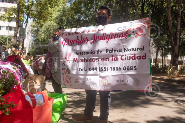 Delfino León Mendoza, artesano mixteco originario de Oaxaca, ofrece sus artesanías a cambio de despensa para poder sobrellevar la Fase 3 de la contingencia por COVID-19, en las afueras de la entra principal de Parque Delta, entre Obrero Mundial y Xochicalco. Debido a la emergencia sanitaria sus ingresos, los cuales dependen de la venta de sus artesanías como bolsas, tapetes, aretes y abanicos elaborados con palma, se han visto afectados.