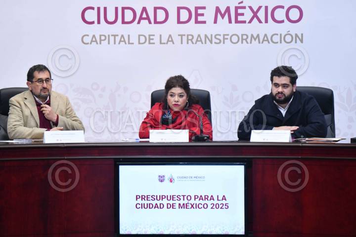 CIUDAD DE MÉXICO, 23DICIEMBRE2024.- Clara Brugada, jefa de Gobierno, durante su intervención en la que indicó los ejes que tendrá el presupuesto pasa la Ciudad de México durante 2025. La acompañan: César Cravioto, secretario de Gobierno, y Juan Pablo de Botton, secretario de Administración y Finanzas. FOTO: MARIO JASSO/CUARTOSCURO.COM