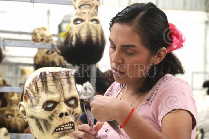 JIUTEPEC, MORELOS, 05MARZO2024.- Un joven trabaja en los detalles de una máscara de látex de un personaje de una historieta en la fábrica Caretas REV. Esta empresa, con más de 70 años de operación, elabora máscaras para Halloween, de personajes de historietas y películas con licencia y creaciones propias que exporta a Estados Unidos. Empleando a más de 400 trabajadores (este número puede aumentar hasta 800 trabajadores en ciertas temporadas), produce tres millones de unidades anuales, se considera la más grande fábrica de su tipo en el país y Latinoamérica. FOTO: MARGARITO PÉREZ RETANA/CUARTOSCURO.COM