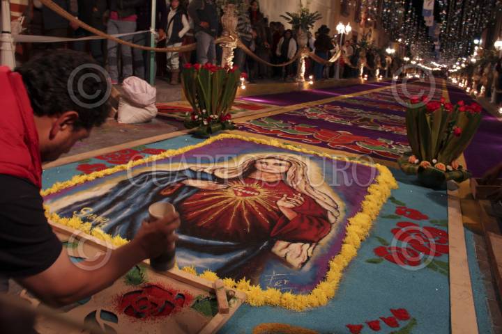 HUAMANTLA, TLAXCALA, 15AGOSTO2013.- Los días 14 y 15 de agosto son días de festejo nocturno en la “Noche que nadie duerme”, festividad que se realiza cada año en Huamantla, en donde el motivo es festejar a la Virgen de la Caridad. Visitantes nacionales y extranjeros son espectadores del momento en el que la Virgen es descendida del altar para después partir en procesión en un carro alegórico. Tapices de flores visten el paso de la imagen religiosa. FOTO: EMMANUEL FLORES / CUARTOSCURO.COM
