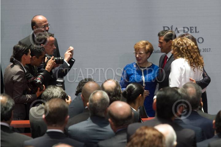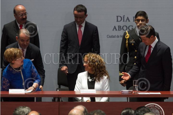 CIUDAD DE MÉXICO, 12JULIO2017.- Raul Andrade Cervántes, Procurador General de la República; la ministra Margarita Luna Ramos; la diputada Sharom Cuenca, y Enrique Peña Nieto, Presidente de México, durante la celebración del Día del Abogado, en el Palacio Nacional. FOTO: MOISÉS PABLO /CUARTOSCURO.COM