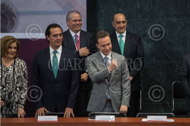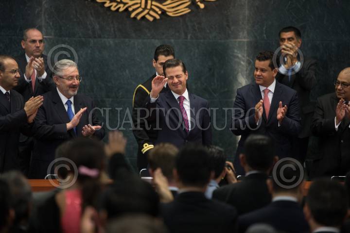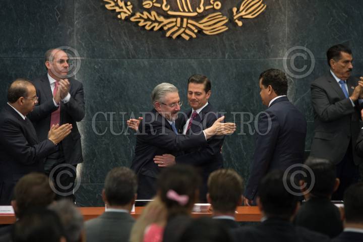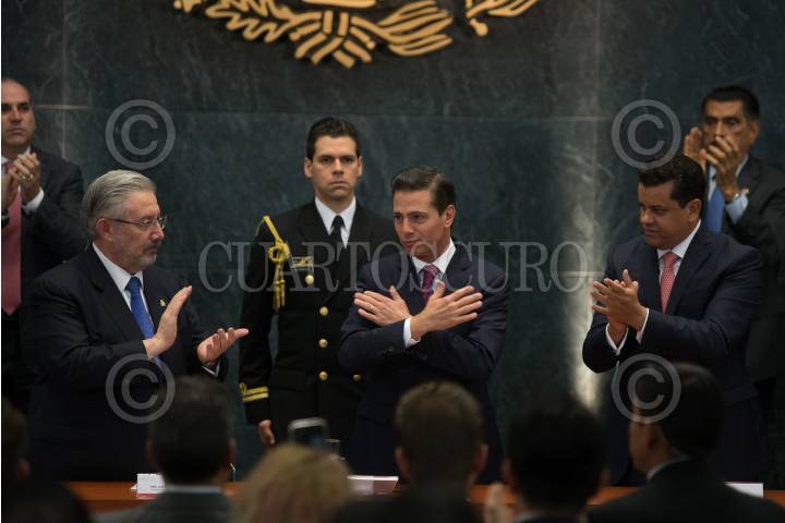 CIUDAD DE MÉXICO, 12JULIO2018.- Alfonso Navarrete Prida, secretario de Gobernación, Luis María Aguilar, presidente de la Suprema Corte de Justicia de la Nación, Enrique Peña Nieto, presidente de México, Edgar Romo García, presidente de la Cámara de Diputados, y Luis Maldonado Venegas, presidente del Comité Rector y de la Academia Nacional de Historia y Geografía, durante la ceremonia por el Día del Abogado en el salón Adolfo López Mateos de la Residencia Oficial de los Pinos. FOTO: ADOLFO VLADIMIR /CUARTOSCURO.COM