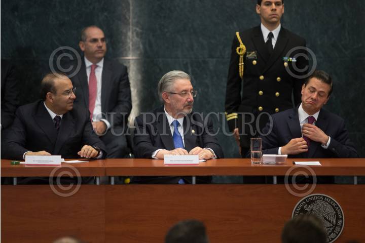 CIUDAD DE MÉXICO, 12JULIO2018.- Alfonso Navarrete Prida, secretario de Gobernación, Luis María Aguilar, presidente de la Suprema Corte de Justicia de la Nación y Enrique Peña Nieto, presidente de México, durante la ceremonia por el Día del Abogado en el salón Adolfo López Mateos de la Residencia Oficial de los Pinos. FOTO: ADOLFO VLADIMIR /CUARTOSCURO.COM