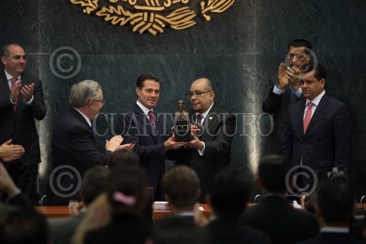 CIUDAD DE MÉXICO, 12JULIO2017.- Enrique Peña Nieto, Presidente de México, encabezó la celebración del Día del Abogado, en el Palacio Nacional. En la imagen el mandatario recibió la estatuilla conmemorativa del Centenario de la Constitución Política de los Estados Unidos Mexicanos, la cual le fue entregada por Venustiano Carranza Peniche. FOTO: MOISÉS PABLO /CUARTOSCURO.COM