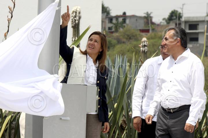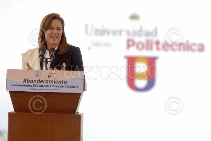 JIUTEPEC, MORELOS, 23MAYO2012.- En el marco del día del estudiante Margarita Zavala visitó esta mañana la Universidad Politécnica del Estado de Morelos (UPEMOR), donde recibió una carta compromiso de manos de una representante de los estudiantes donde se comprometían a promover la paz y evitar dentro se su institución cualquier tipo de acto violento, en este mismo evento se firmó una declaratoria por la paz. Para finaliza tuvo lugar el abanderamiento de las Comunidades Educativa Libres de Violencia, mientras la primera dama entonaba la canción “color esperanza”. FOTO: ALMA LAFAYET /CUARTOSCURO.COM
