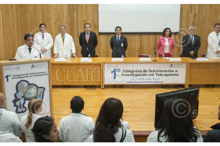 MÉXICO, D.F., 27MAYO2015.- Moisés Selman Lama, director de Investigación; Luis Alonso Herrera, director de investigación del Instituto Nacional de Cancerología; Raúl Sansores Martínez, jefe del departamento de investigación en Tabaquismo y EPOC del INER; Jorge Salas Hernández, director general del Instituto Nacional de Enfermedades Respiratorias (INER); Maria del Carmen Fernández, directora general de centros de integración juvenil; Malaquias López, jefe del departamento de medicina preventiva en la UNAM, y Dean Schraufnagel, doctor de la Universidad de Illinois de Chicago, encabezaron la inauguración del 1er Congreso de Intervención e Investigación en Tabaquismo que se celebra en el marco del día Mundial sin Tabaco en el Instituto Nacional de Enfermedades Respiratorias. FOTO: DIEGO SIMÓN SÁNCHEZ /CUARTOSCURO.COM