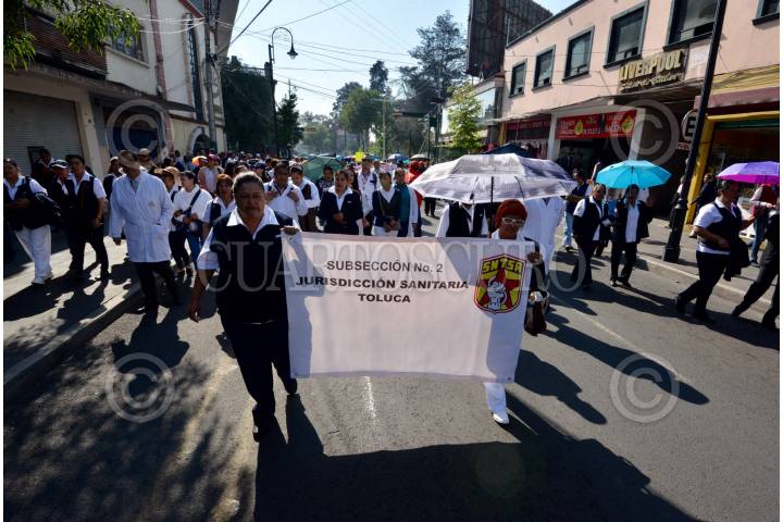 TOLUCA, ESTADO DE MÉXICO, 01MAYO2018.- Médicos, enfermeras, personal de SUEM, y trabajadores del ISEM, en el marco del Día Internacional del Trabajo marcharon por las principales calles de Toluca, exigiendo mejoras salariales, insumos y medicamentos para poder atender en los hospitales del Estado de México, concluir obras y aclarar desvíos de fondos de la Secretaría de Salud en la anterior administración. FOTO: ARTEMIO GUERRA BAZ /CUARTOSCURO.COM