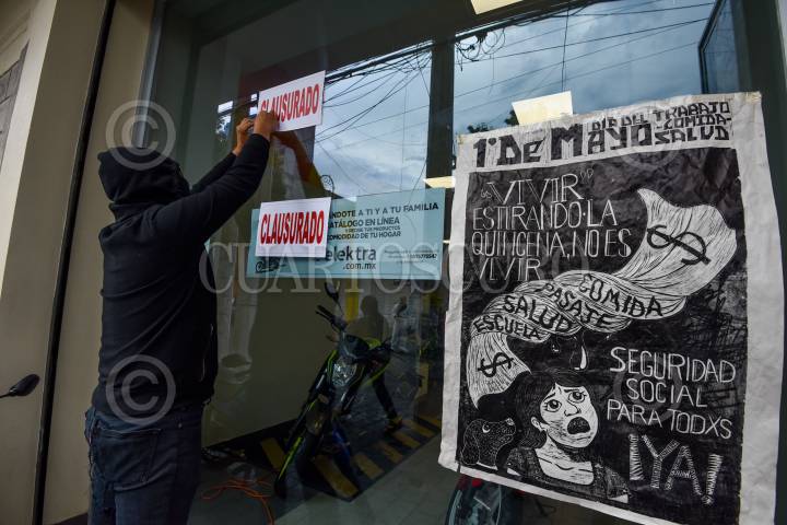 En el marco del Día de Trabajo integrantes de diversos colectivos se manifestaron en la ciudad de Toluca y clausuraron de forma simbólica tiendas que no ha pasado actividades durante la fase 3 de la contingencia por COVID-19.