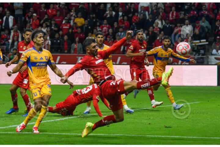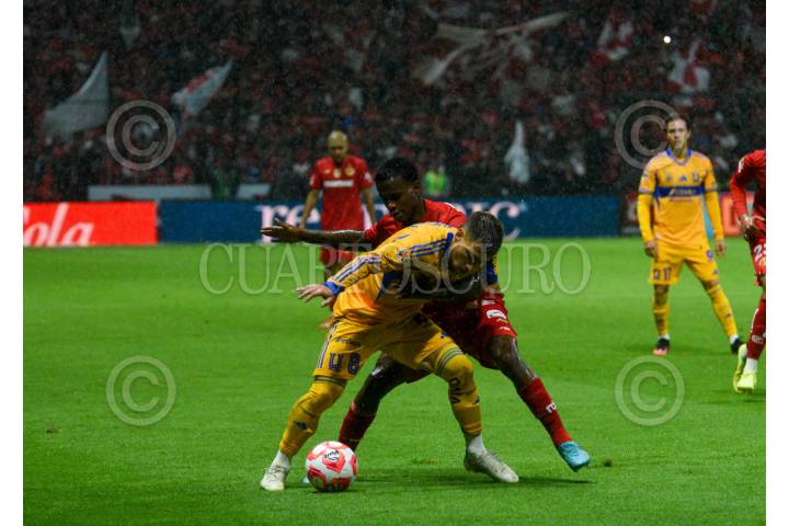 TOLUCA, ESTADO DE MÉXICO, 26JULIO2025.- Fernando Gorriarán medio de Tigres pelea el esférico con Helio Nunes delantero de los Diablos de Toluca en el partido correspondiente a la jornada 3 del Torneo Apertura 2025 de la Liga MX, con un marcador final 3-4 a favor de Tigres. FOTO: CRISANTA ESPINOSA AGUILAR /CUARTOSCURO.COM