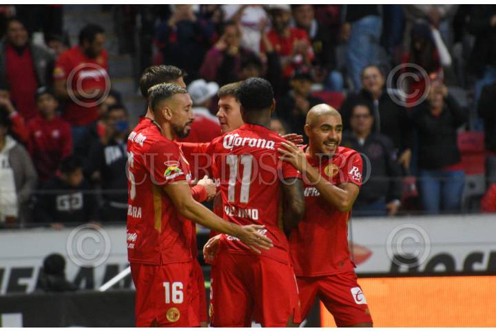 TOLUCA, ESTADO DE MÉXICO, 26JULIO2025.- Jugadores de los Diablos de Toluca festejan una de 3 anotaciones ante la escuadra de Tigres, quienes lograron la victoria en el partido correspondiente a la jornada 3 del Torneo Apertura 2025 de la Liga MX, con un marcador final 3-4. FOTO: CRISANTA ESPINOSA AGUILAR /CUARTOSCURO.COM