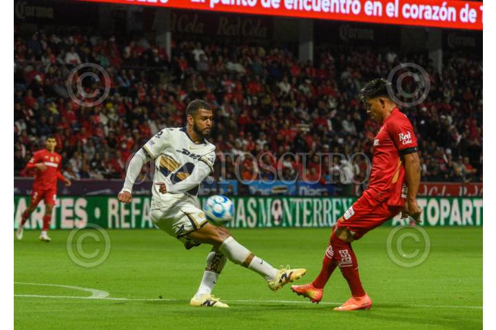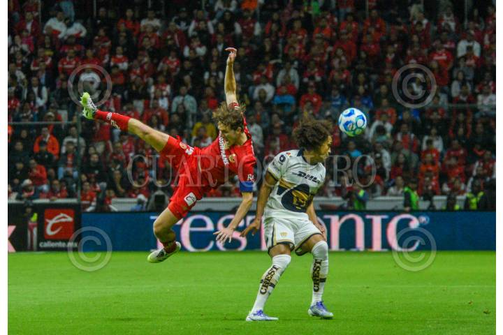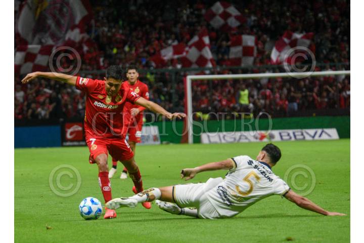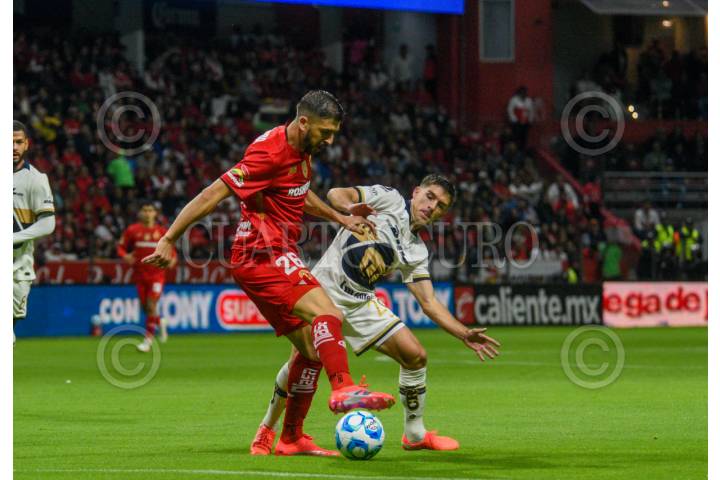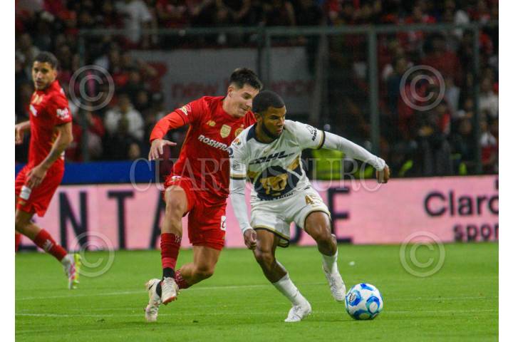 TOLUCA, ESTADO DE MÉXICO, 16AGOSTO2025.- Juan Domínguez medio de los Diablos de Toluca se enfrenta a Rubén Duarte defensa de la escuadra universitaria Pumas en la cancha del estadio Nemesio Diez, en el partido correspondiente a la jornada 5 del Torneo Apertura 2025 de la Liga MX, con un marcador final 1-1. FOTO: CRISANTA ESPINOSA AGUILAR/CUARTOSCURO.COM