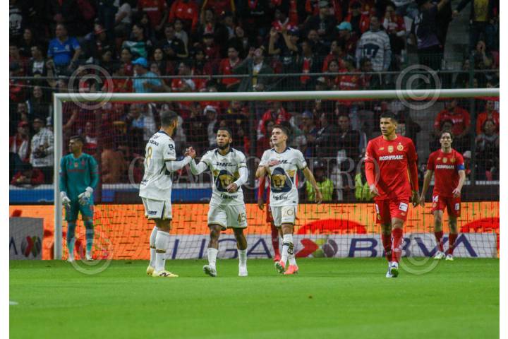 TOLUCA, ESTADO DE MÉXICO, 16AGOSTO2025.- José Caicedo, Pedro Vite y Santiago Trigos jugadores de Pumas festejan su anotación ante la escuadra de los Diablos de Toluca quienes se enfrentaron en la cancha del estadio Nemesio Diez, en el partido correspondiente a la jornada 5 del Torneo Apertura 2025 de la Liga MX, con un marcador final 1-1. FOTO: CRISANTA ESPINOSA AGUILAR/CUARTOSCURO.COM
