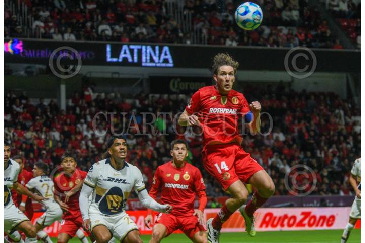TOLUCA, ESTADO DE MÉXICO, 16AGOSTO2025.- Marcel Ruiz medio de los Diablos de Toluca pelea el esférico durante el encuentro ante la escuadra universitaria de Pumas en la cancha del estadio Nemesio Diez, en el partido correspondiente a la jornada 5 del Torneo Apertura 2025 de la Liga MX, con un marcador final 1-1. FOTO: CRISANTA ESPINOSA AGUILAR/CUARTOSCURO.COM