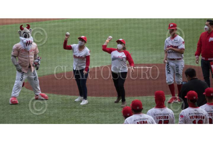 Beisbol entre Diablos de México frnete a Veracruz. Dos mujeres sobrevivientes de cáncer en el inicio del encuentro.