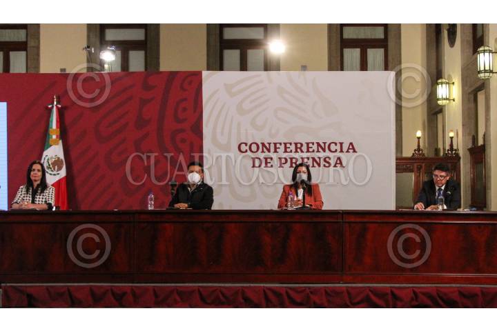 Diana Álvarez, Ana Bárbara Mungaray en compañía de Horacio Esquivel Martínez, durante la conferencia de Créditos en Palacio Nacional. FOTO: ROGELIO MORALES /CUARTOSCURO.COM